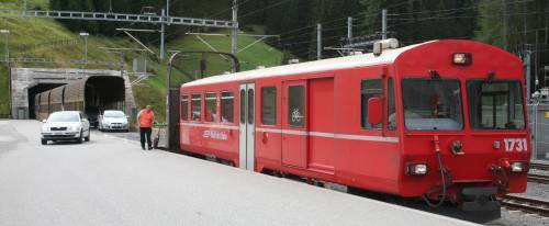From Klosters to Vereina and drive the car onto a train for a short journey through a tunnel and disembark in Saglains. Here's the train fresh from the tunnel. Note the cars driving off it - and the train driver with his bike ....