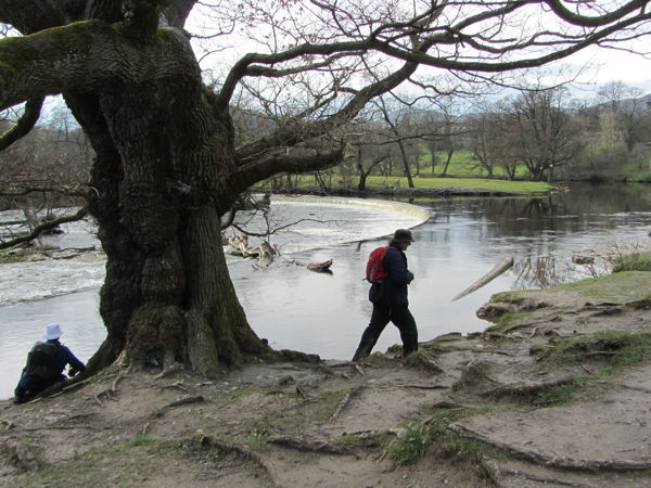 Having spent the night at The Druid in Llanferres it is only half an hour's drive to Llangollen for our 8 mile all-day walk. But there is a hiccup. Duncan's sprained finger, damaged yesterday on our first Flintshire walk, is now very swollen and in danger of having its circulation cut off by his wedding ring. Physician Mark, with great generosity, offers to take him to Wrexham A&E so Duncan and Mark pop across to Wrexham for an appointment with a rotating saw and a long wait, while John and Tim start the walk from the car park above Horseshoe Falls so we can meet up at Llangollen, half way round. The town itself is worth a visit, boasting a wide variety of shops, steam engines (Tim was impressed by a wedding party being held on the train) and horse-drawn narrow boats. All in a dramatic valley, a World Heritage site. Finally we all meet up for lunch at the Corn Mill and follow the second half of the walk together. This takes us up the valley sides to Horseshoe Falls, where Thomas Telford created a scenic head of water for his new Llangollen canal, a hugely impressive site that incorporates the Pontcysyllte viaduct and leads to the Shropshire Union Canal.